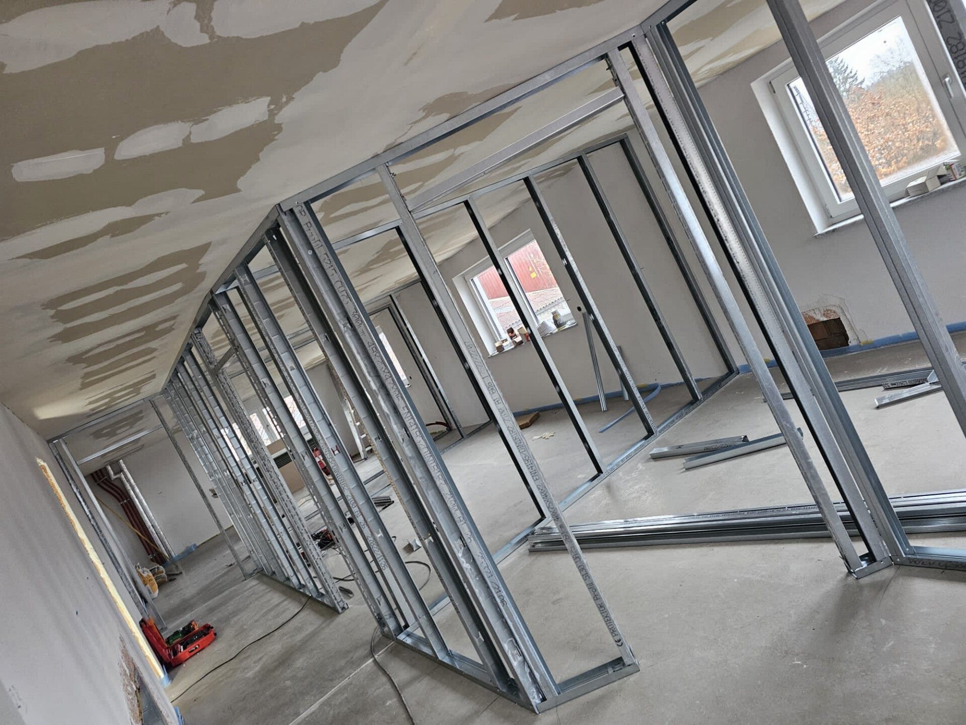 Trockenbauarbeiten: Für die optimale Aufteilung von Räumen, zum Abhängen von Decken und zur Vorbereitung des Endbodenbelages nutzen wir bewährte Trockenbaulösungen.